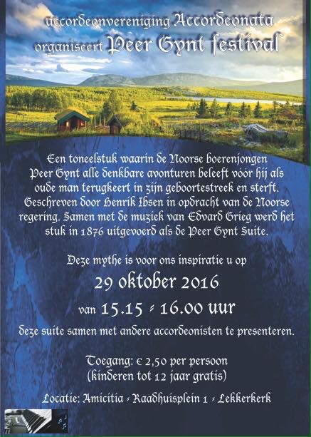 Een fantastische muziekdag bij Accordeonata in Lekkerkerk Op 29 oktober 2016 hield Accordeonata, bij het behalen van het 65 jarig bestaan, het Peer Gynt Festival. Andere verenigingen waren gevraagd, gezamenlijk muziek in te studeren op deze dag en tot slot in concertvorm de werken ten gehore te brengen. Op de lessenaar stond muziek van Edvard Grieg, 4 muziekwerken uit de Peer Guint Suite. Met ongeveer 60 muzikanten werd in enkele uren tijd, natuurlijk afgewisseld met pauzes, even op adem komen en natuurlijk een goede lunch aan het eigen maken van de muziek gewerkt.